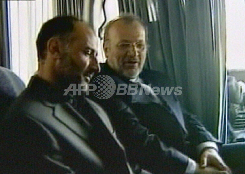 【テヘラン/イラン 4日 AFP】バグダッドで2月に誘拐されたJalal Sharafi第2書記官(40)の解放が発表された2日、イランのアラビア語衛星テレビ局アルアラム(Al-Alam)が同書記官の映像を放映した。映像に帰国したSharafi第2書記官を迎えるマヌーチェフル・モッタキ(Manouchehr Mottaki)外相の姿が映し出された。写真は同日、テヘラン(Tehran)に到着した書記官(左)を迎えるモッタキ首相。(c)AFP/DSK
