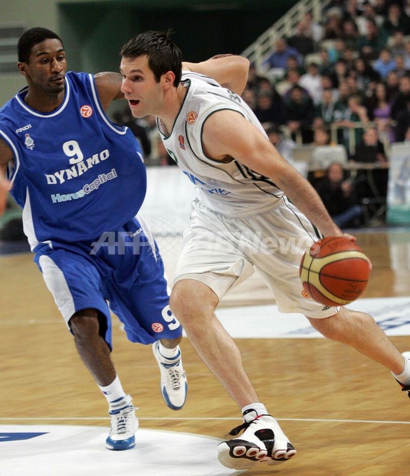 【アテネ/ギリシャ 3日 AFP】バスケットボール・ユーロリーグ・決勝トーナメント準々決勝、パナシナイコス・アテネ(Panathinaikos Athens)vsディナモ・モスクワ(Dynamo Moscow)、第1戦。試合はパナシナイコス・アテネが80-58でディナモ・モスクワを降し、準決勝進出へ大きく前進した。写真は、ディナモ・モスクワのTaquan Dean(左)をドリブルで振り切るパナシナイコス・アテネのサニ・ベシロビッチ(Sani Becirovic)。(c)AFP/STR