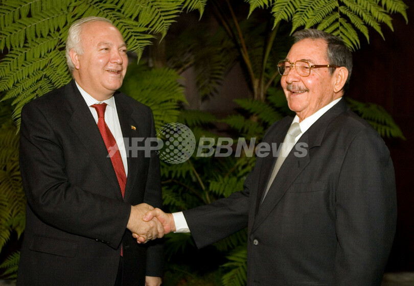 【ハバナ/キューバ 4日 AFP】キューバを訪問中のスペインのミゲル・アンヘル・モラティノス(Miguel Angel Moratinos)外相は3日、フェリペ・ラモン・ペレス・ロケ(Felipe Ramon Perez Roque)外相と会談し、政治・人権に関する2国間の協議機関を設立することで合意した。写真は3日、首都ハバナ(Havana)で会談前に握手するモラティノス外相(左)とラウル・カストロ(Raul Castro)第1副議長。(c)AFP/ADALBERTO ROQUE