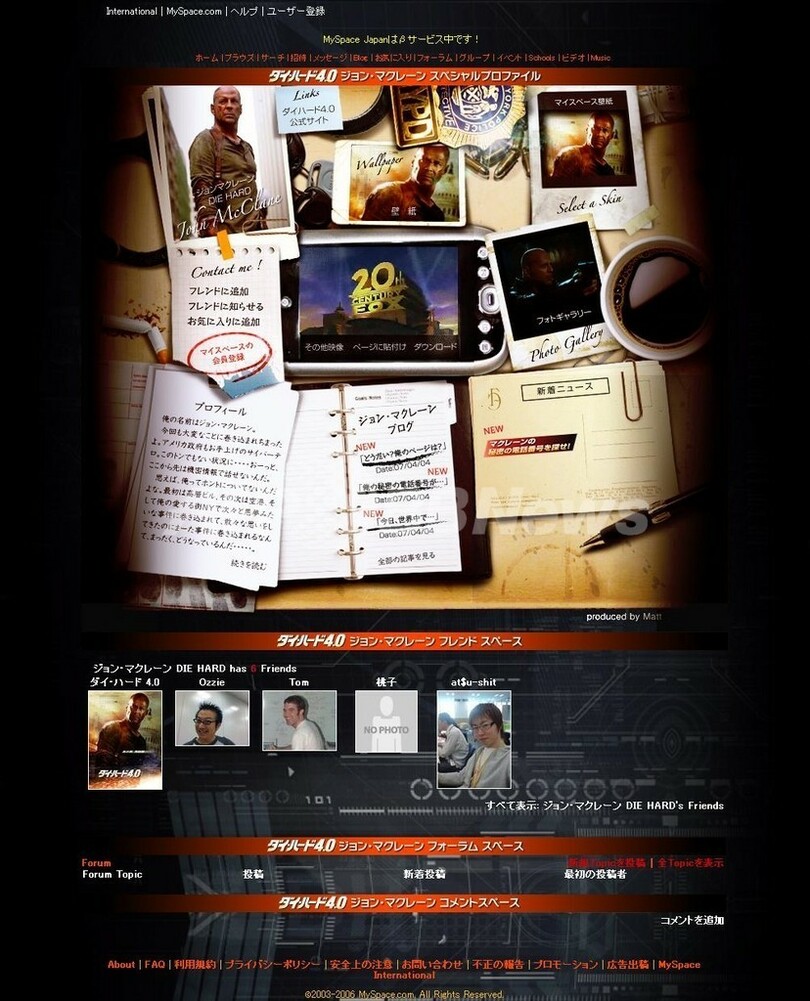 デジタルでは、日本で去年11月にサービスを開始した世界最大のSNS、「マイスペース(MySpace.com)」にカスタムコミュニティを設置。ブルース・ウィリス(Bruce Willis)扮する主人公のジョン・マクレーンがマイスペースの1ユーザーとして登場する。ユーザーはマクレーンとバーチャルな友だちになれる。マイスペースを映画のプロモーション媒体に選んだ理由について、同社20世紀フォックス映画マーケティング本部部長の河合要恵氏は次のように語る。