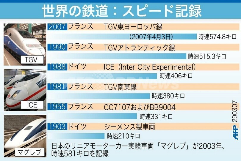 欧州ではこれまで、TGV各線やドイツのICE(Inter City Experimental)などが高速記録を作ってきた。なお、日本ではリニアモーターカー「マグレブ」が2003年、時速581キロを記録している。