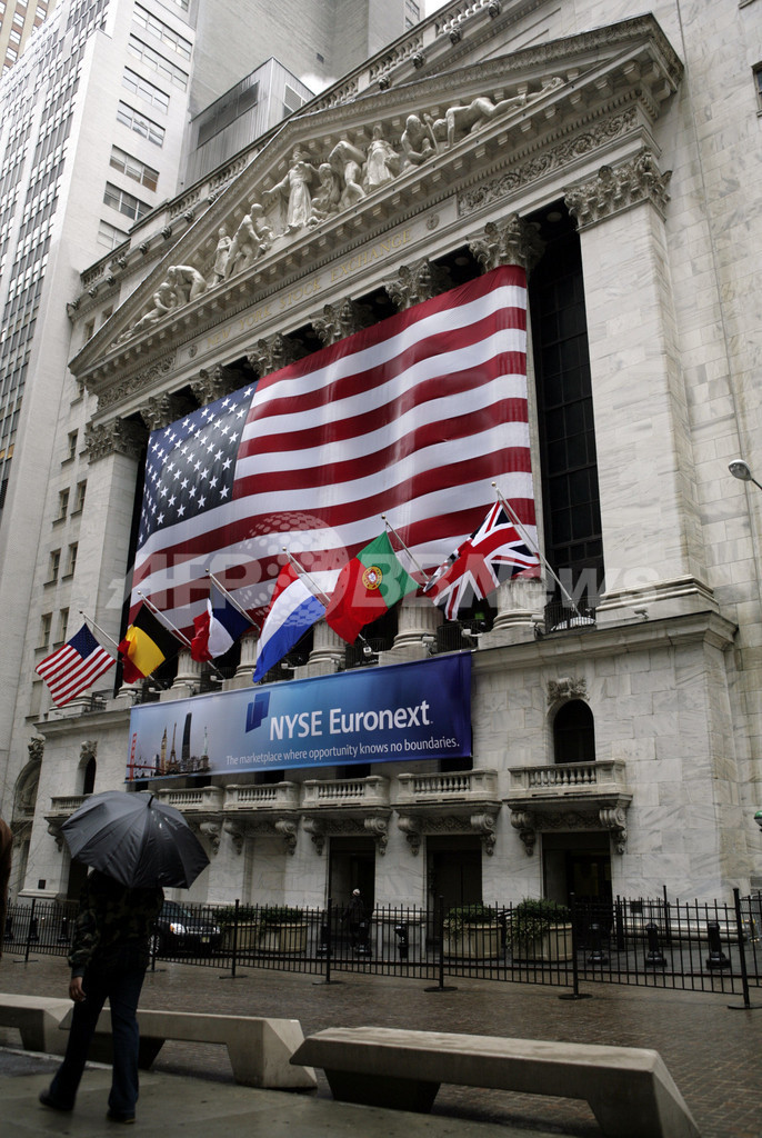 【ニューヨーク/米国 5日 AFP】3月にユーロネクスト(Euronext)とニューヨーク証券取引所(New York Stock Exchange、NYSE)が合併して誕生したNYSEユーロネクスト(NYSE Euronext)が4日、株式をニューヨーク、パリ(ユーロネクスト)の両市場で上場する。パリ市場での初値は75.61ユーロ(約1万1995円)。株式時価総額は193億2000万ユーロ(約3兆650億円)となり、ユーロネクスト市場のオープン価格を基に計算すると上場証券取引所としては世界最大となる。写真は同日、ニューヨーク証券取引所に掲げられたNYSEユーロネクストの横断幕。(c)AFP/NICHOLAS ROBERTS