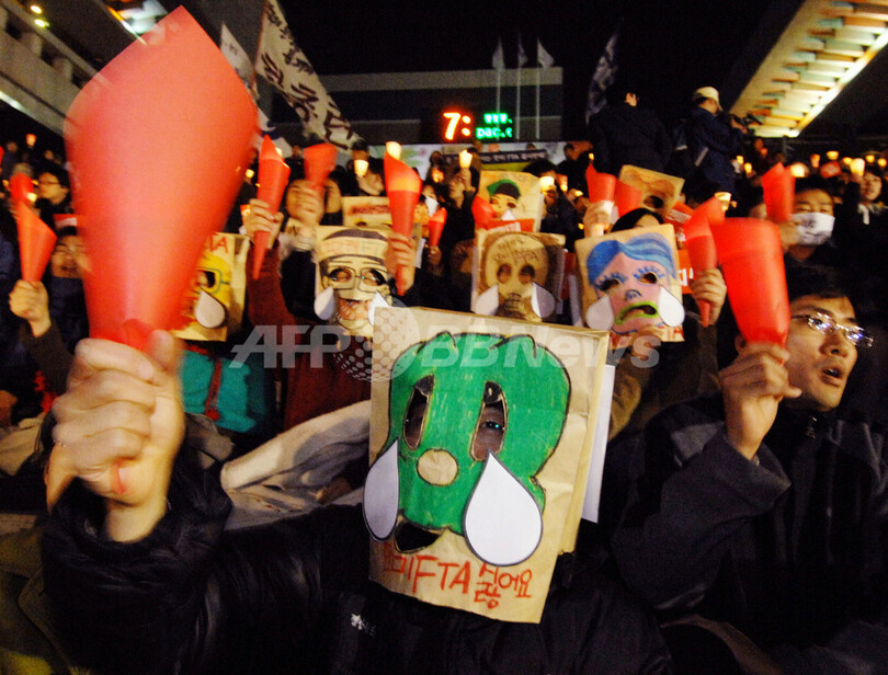 写真は、ソウルで2日開かれた、米韓FTA反対派らの集会。(c)AFP/KIM JAE-HWAN
