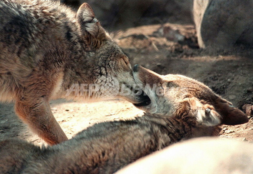 写真は、ロシア・モスクワの動物園でじゃれ合うコヨーテ(1997年4月9日撮影)。(c)AFP