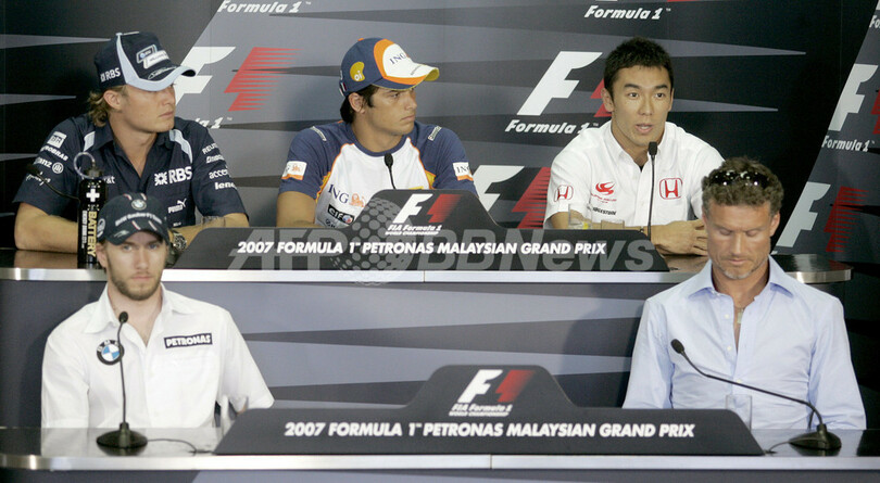 写真は、会見に臨む(左から)ウィリアムズ(%%Williams%%)のニコ・ロズベルグ(%%Nico Rosberg%%)、BMWザウバー(%%BMW Sauber%%)のニック・ハイドフェルド(%%Nick Heidfeld%%)、ルノー(%%Renault%%)のネルソン・ピケJr(%%Nelson Piquet Jr%%)、スーパーアグリ(%%Super Aguri%%)の佐藤琢磨(%%Takuma Sato%%)、レッドブル(%%Red Bull%%)のデビット・クルサード(%%David Coulthard%%)。(c)AFP/TENGKU BAHAR