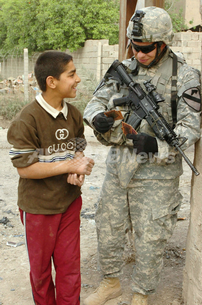 ニュース 戦争・紛争 バグダッド内外で米兵6人が死亡 - イラク 2007年4月5日 20:05 発信地:イラク [ 中東・北アフリカ イラク ] このニュースをシェア 写真は、ハリス(Khalis)で米兵にトランプを売る少年(3月30日撮影)。(c)AFP/Spc.Ryan Stroud 【バグダッド/イラク 5日 AFP】米、イラク両軍による大規模な掃討作戦が8週目に突入した首都バグダッドおよび周辺地域で、米兵6人が殺害された。駐イラク米軍当局が5日、発表した。写真は、ハリス(Khalis)で米兵にトランプを売る少年(3月30日撮影)。(c)AFP/Spc.Ryan Stroud 戦争・紛争 一覧へ> メディア・報道関係・法人の方向け 写真・動画 購入のお問合せ>