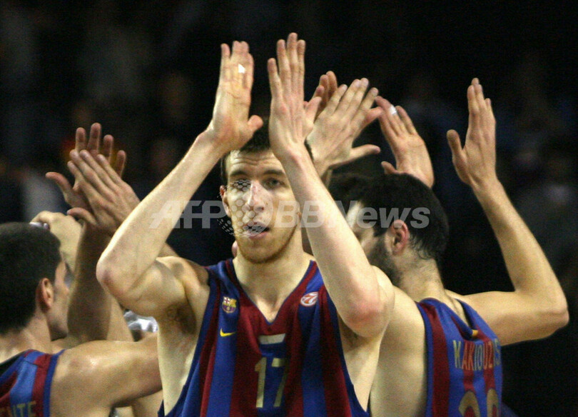 【バルセロナ/スペイン 5日 AFP】バスケットボール、ユーロリーグ・決勝トーナメント準々決勝、ウィンタートゥールFCバルセロナ(Winterthur FC Barcelona)vsウニカハ・マラガ(Unicaja Malaga)、第2戦。試合はバルセロナが80-58でウニカハ・マラガを降し、通算成績を1勝1敗とした。写真は、チームの勝利を喜ぶバルセロナのフランシスコ・バスケス(Francisco Vazquez、中央)。(c)AFP/LLUIS GENE