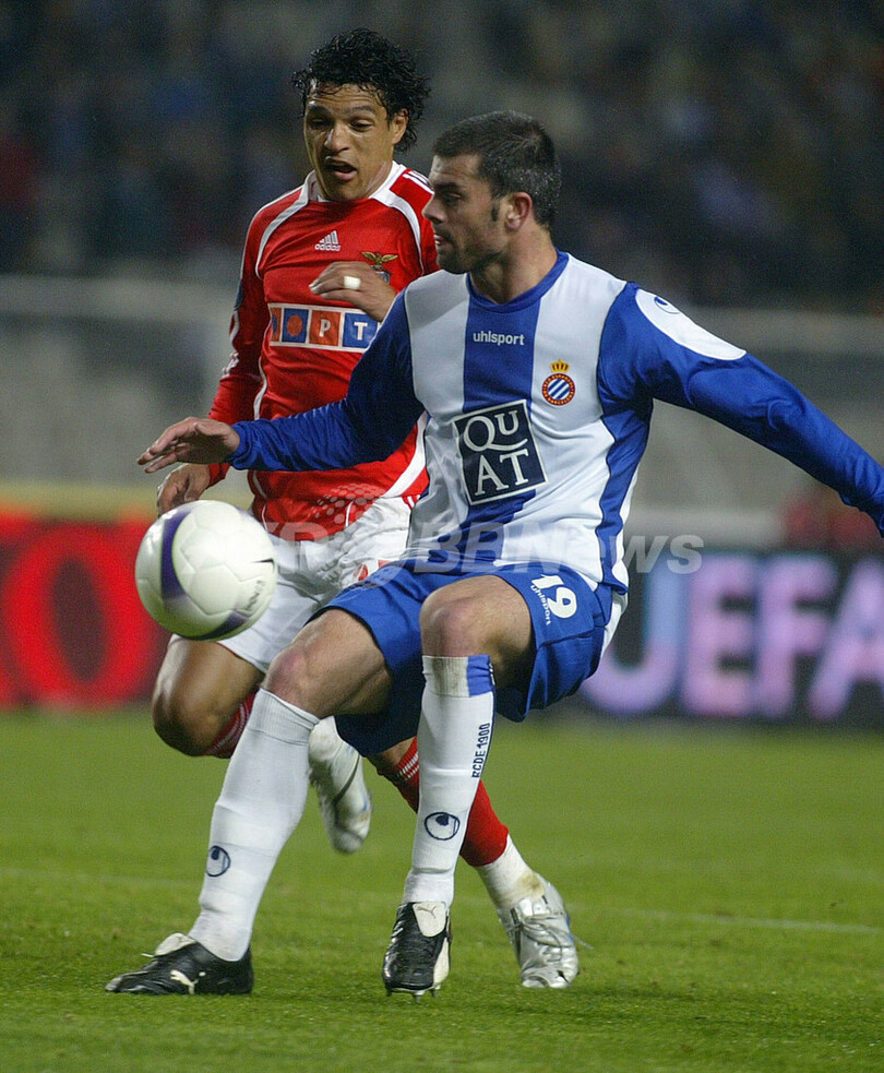 【バルセロナ/スペイン 5日 AFP】サッカー、UEFA杯(UEFA Cup)・準々決勝、ベンフィカ(Benfica)vsエスパニョール(Espanyol)、第1戦。後半13分、エスパニョールのワルテル・パンディアーニ(Walter Pandiani)は、チーム3点目となるゴールを決めて歓喜する。試合はエスパニョールが3-2でベンフィカに勝利し、ベスト4進出へ向けて大きな1勝を挙げた。(c)AFP/CESAR RANGEL