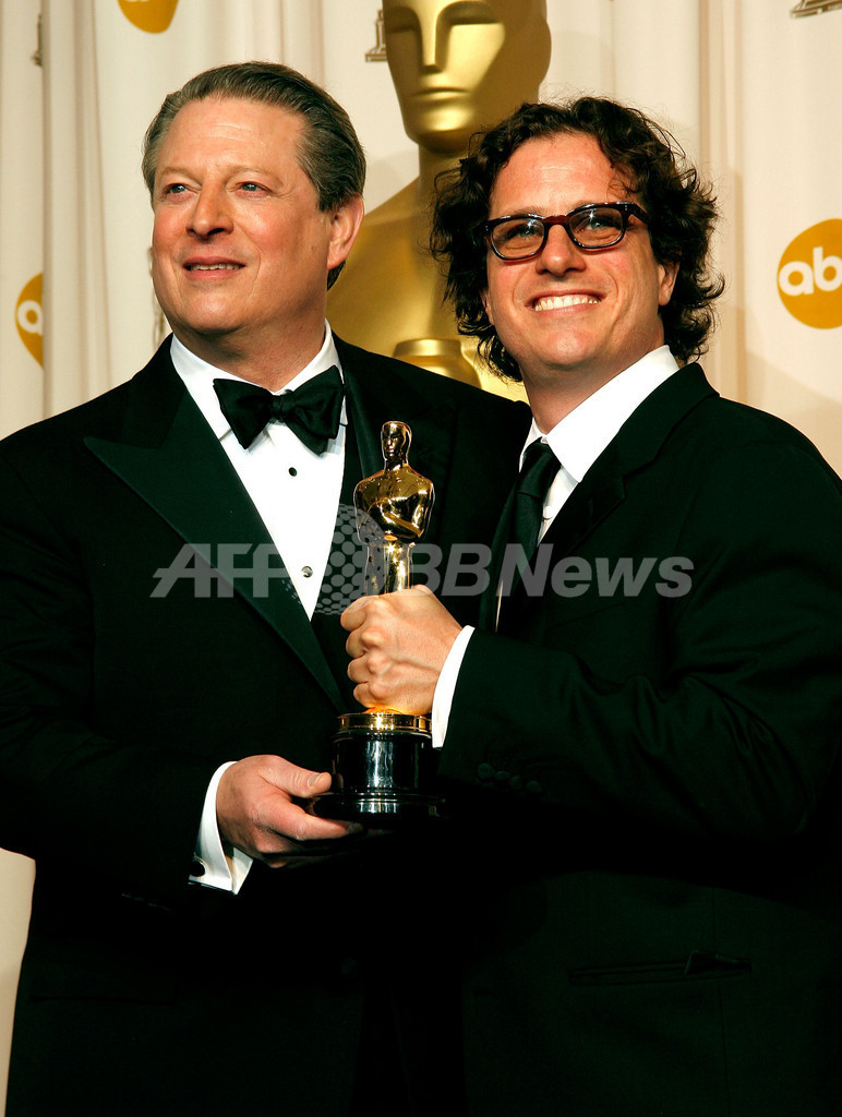写真は第79回アカデミー賞授賞式で「不都合な真実」が長編ドキュメンタリー賞を受賞し、オスカー像を手にポーズをとるゴア氏(左)と監督を務めたデイビス・グッゲンハイム(Davis Guggenheim)(2007年2月25日撮影)。(c)AFP/Getty Images Vince Bucci