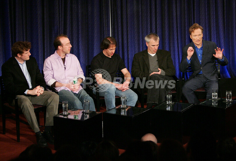 【ニューヨーク/米国 6日 AFP】テレビ局NBCのトーク番組「Late Night with Conan O’Brien」の関係者らが出席し、テレビ&ラジオ博物館(Museum of Television & Radio)が主催するトークイベント「Simply Absurd: The Comedy of Late Night with Conan O’Brien」が5日、テレビ&ラジオ博物館で開催された。写真は、会場に姿を見せた「Late Night with Conan O’Brien」の脚本家たち。(左から)ブライアン・スタック(Brian Stack)、司会も務めるコナン・オブライエン(Conan O’Brien)、マイケル・ゴードン(Michael Gordon)、ブライアン・マッカン(Brian McCann)、マイク・スウィーニー(Mike Sweeney)。(c)AFP/Getty Images Evan Agostini