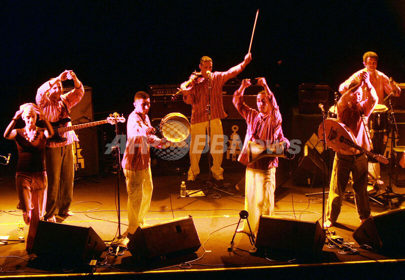 【トゥルコアン/フランス 6日 AFP】トゥアレグ族(Tuareg )のバンドTinariwenが4日、同市内のGrand Mixホールでコンサートを行った。Tinariwenは主にフランス語とタマシェク語(Tamashek )で歌い、「Tishoumaren(『無職の人の音楽』の意)」と呼ばれるスタイルで演奏する。その楽曲は、マリ共和国政府からの独立を歌ったものが多い。さらに、Tinariwenはエレキギターを用いた最初のトゥアレグ族のバンドだと言われている。写真は、ステージで演奏を繰り広げるメンバーたち。(c)AFP/FRANCOIS LO PRESTI