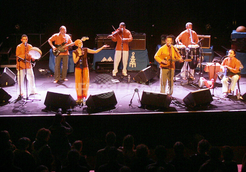 【トゥルコアン/フランス 6日 AFP】トゥアレグ族(Tuareg )のバンドTinariwenが4日、同市内のGrand Mixホールでコンサートを行った。Tinariwenは主にフランス語とタマシェク語(Tamashek )で歌い、「Tishoumaren(『無職の人の音楽』の意)」と呼ばれるスタイルで演奏する。その楽曲は、マリ共和国政府からの独立を歌ったものが多い。さらに、Tinariwenはエレキギターを用いた最初のトゥアレグ族のバンドだと言われている。写真は、ステージで演奏を繰り広げるメンバーたち。(c)AFP/FRANCOIS LO PRESTI