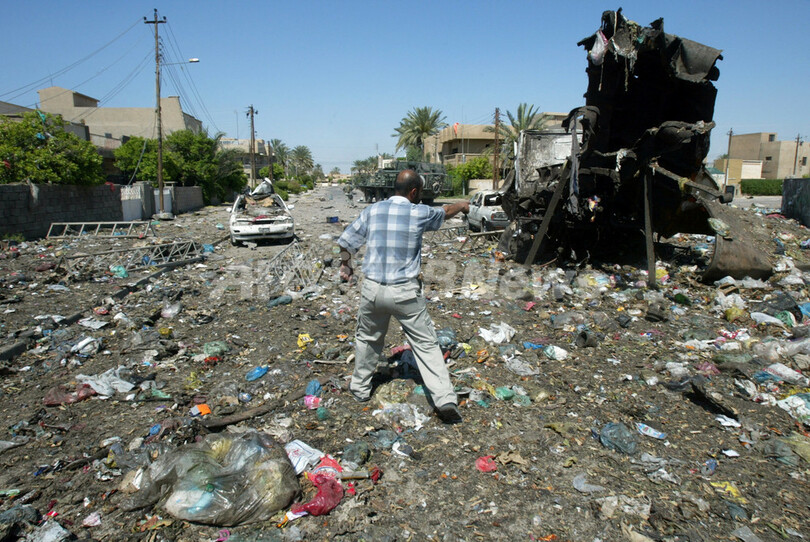 写真は5日、バグダッド市内で発生した別の車両爆弾爆発事件で、使用されたゴミ収集車を指し示す男性。(c)AFP/WISAM SAMI