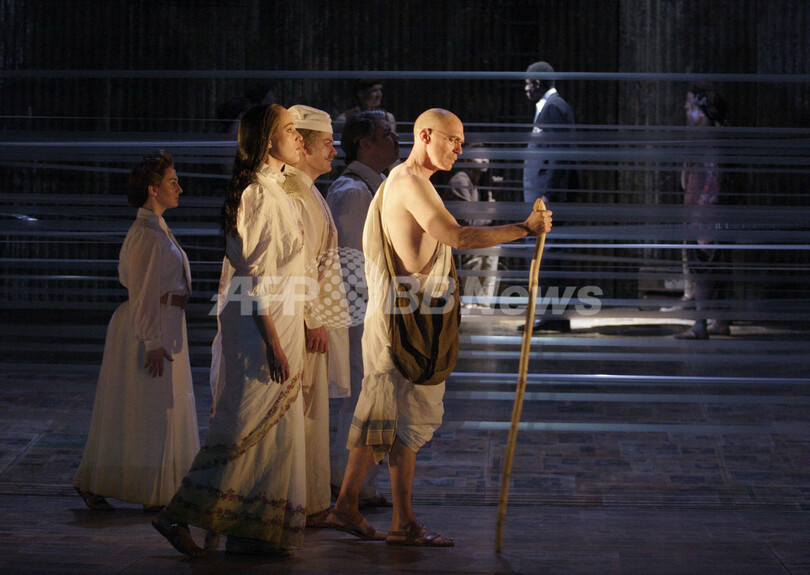 【ロンドン/英国 7日 AFP】米作曲家、フィリップ・グラス(Philip Glass)が音楽を手掛けるオペラ「Satyagraha」が劇場コロシアム(Coliseum)で6日、プレミア公演を迎えた。この舞台は、マハトマ・ガンジー(Mahatma Gandhi)氏が率いた独立運動、「非暴力不服従運動(Satyagraha)」で果たされたインドの英国からの独立60周年を記念したものである。写真は同プレミアでパフォーマンスを披露するガンジー役の俳優Alan Oke。(c)AFP/ENGLISH NATIONAL OPERA/CATHERINE ASHMORE