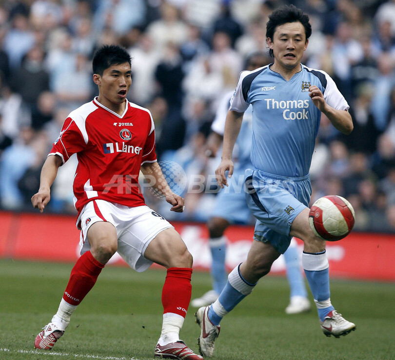 【マンチェスター/英国 6日 AFP】サッカー、イングランド・プレミアリーグ・第32節、マンチェスター・シティ(Manchester City)vsチャールトン・アスレチック(Charlton Athletic)。試合は0ー0の引き分けに終わり、両チーム勝ち点1ずつを分け合った。写真はボールを追うマンチェスター・シティのスン・ジハイ(Jihai Sun)をマークするチャールトンのジョン・ジー(Zheng Zhi)。(c)AFP/ANDREW YATES
