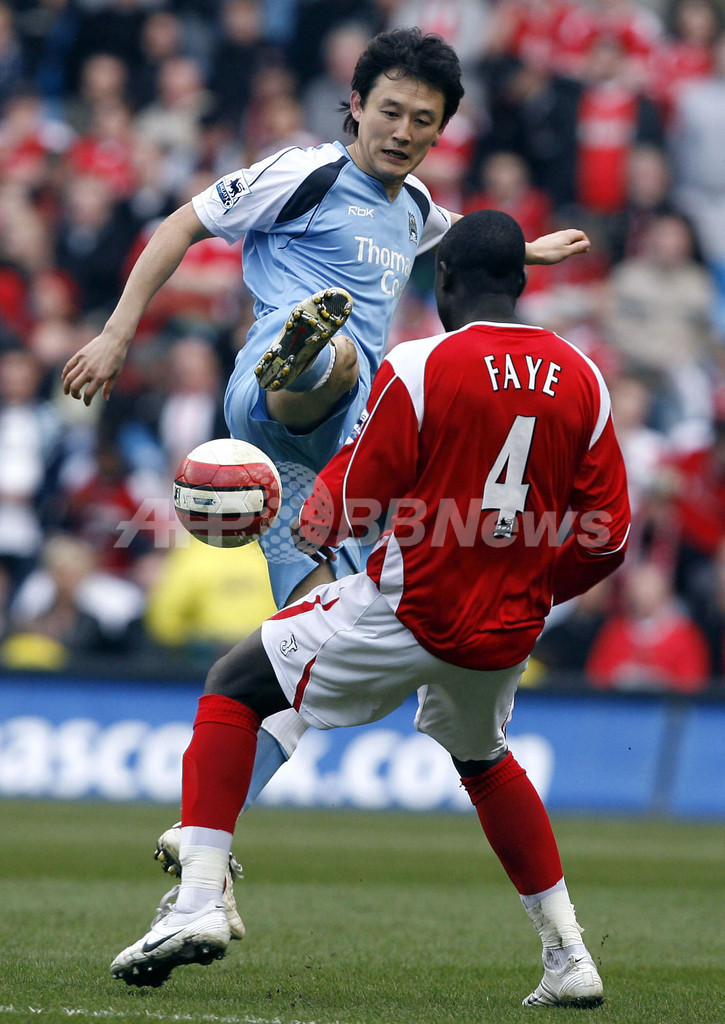 【マンチェスター/英国 6日 AFP】サッカー、イングランド・プレミアリーグ・第32節、マンチェスター・シティ(Manchester City)vsチャールトン・アスレチック(Charlton Athletic)。試合は0ー0の引き分けに終わり、両チーム勝ち点1ずつを分け合った。写真はボールを追うマンチェスター・シティのスン・ジハイ(Jihai Sun)をマークするチャールトンのジョン・ジー(Zheng Zhi)。(c)AFP/ANDREW YATES