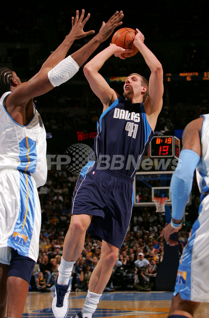 【デンバー/米国 6日 AFP】06-07NBA、デンバー・ナゲッツ(Denver Nuggets)vsダラス・マーベリックス(Dallas Mavericks)。ナゲッツのアレン・アイバーソン(Allen Iverson)はこの試合、22得点5アシストを挙げ、チームの勝利に貢献した。試合は、主導権を握られていたナゲッツが後半に逆転し、75-71でマーベリックスを破り4連勝を飾った。写真は、チームメイトのマーカス・キャンビー(Marcus Camby、左2)のスクリーンを利用してマーベリックスのデビン・ハリス(Devin Harris、中央)のマークを外し、シュート体勢に入るアイバーソン(右)。(c)AFP/Getty Images Doug Pensinger