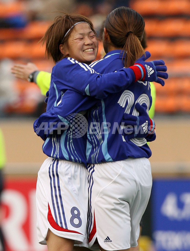 【東京 7日 AFP】女子サッカー、北京五輪アジア最終予選・グループA、日本vsベトナム、第1戦。前半36分、先制ゴールを決めた日本の澤穂希(Homare Sawa)は、チームメイトの宮間あや(Aya Miyama、左)と抱擁を交わしてゴールの喜びを分かち合う。試合は日本が2-0でベトナムを降し、グループリーグ初戦を勝利で飾った。(c)AFP/TOSHIFUMI KITAMURA