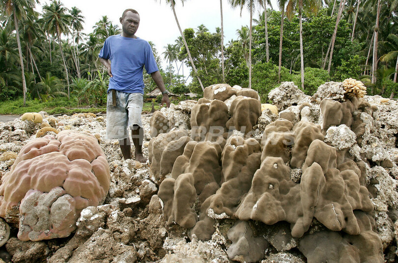 写真は水面に押し上げられたさんご礁の上に座る住民。(c)AFP/William WEST
