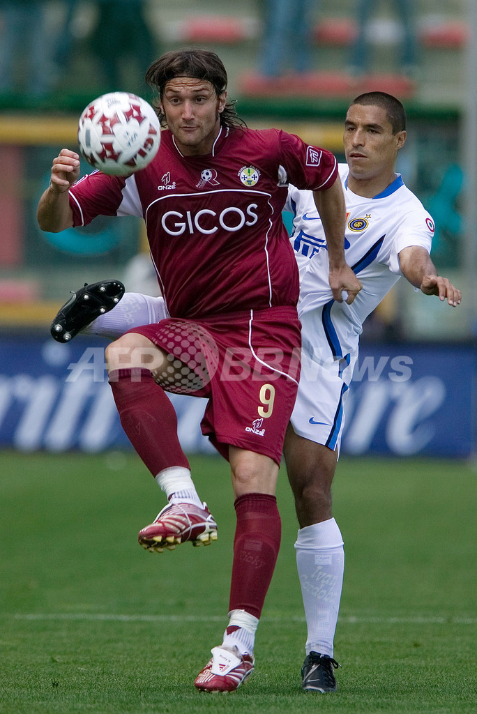【レッジョ・カラブリア/イタリア 7日 AFP】サッカー、イタリア・セリエA・第31節、レッジーナ(Reggina)vsインテル(Inter Milan)。試合はスコアレスドローに終わり、インテルのアウェーでの連勝は11で止まった。写真は、レッジーナのロランド・ビアンキ(Rolando Bianchi、左)にプレスをかけるインテルのイバン・コルドバ(Ivan Ramiro Cordoba)。(c)AFP/ANTONIO TACCONE