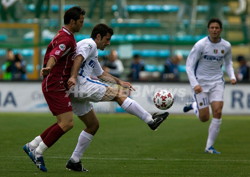 【レッジョ・カラブリア/イタリア 7日 AFP】サッカー、イタリア・セリエA・第31節、レッジーナ(Reggina)vsインテル(Inter Milan)。試合はスコアレスドローに終わり、インテルのアウェーでの連勝は11で止まった。写真は、レッジーナのロランド・ビアンキ(Rolando Bianchi、左)にプレスをかけるインテルのイバン・コルドバ(Ivan Ramiro Cordoba)。(c)AFP/ANTONIO TACCONE