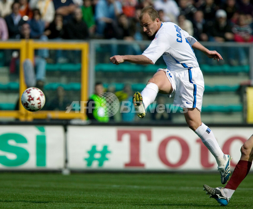 【レッジョ・カラブリア/イタリア 7日 AFP】サッカー、イタリア・セリエA・第31節、レッジーナ(Reggina)vsインテル(Inter Milan)。試合はスコアレスドローに終わり、インテルのアウェーでの連勝は11で止まった。写真は、レッジーナのロランド・ビアンキ(Rolando Bianchi、左)にプレスをかけるインテルのイバン・コルドバ(Ivan Ramiro Cordoba)。(c)AFP/ANTONIO TACCONE