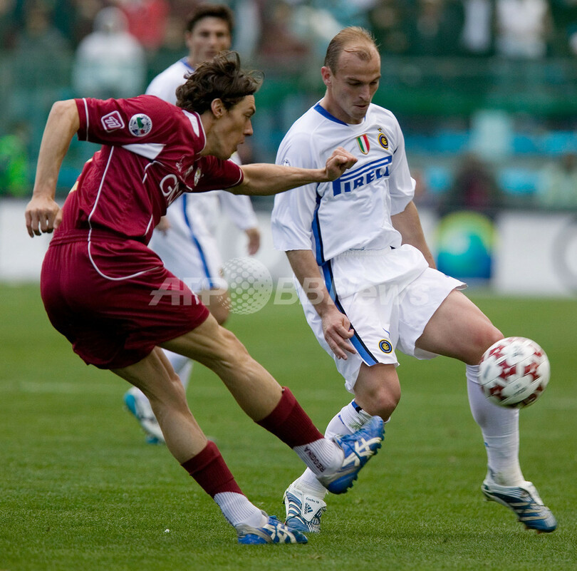【レッジョ・カラブリア/イタリア 7日 AFP】サッカー、イタリア・セリエA・第31節、レッジーナ(Reggina)vsインテル(Inter Milan)。試合はスコアレスドローに終わり、インテルのアウェーでの連勝は11で止まった。写真は、レッジーナのロランド・ビアンキ(Rolando Bianchi、左)にプレスをかけるインテルのイバン・コルドバ(Ivan Ramiro Cordoba)。(c)AFP/ANTONIO TACCONE