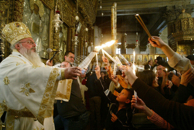 【ベツレヘム/パレスチナ自治区 7日 AFP】世界各地では、キリスト教の行事、復活祭(イースター)が祝われている。ヨルダン川西岸(West Bank)のベツレム(Bethlehem)でも7日、聖誕教会(Church of the Nativity)で聖土曜日を祝うミサが行われた。写真は、ミサに参列した人々へ聖なる炎を分け与えるローマ正教の司祭。(c)AFP/MUSA AL-SHAER