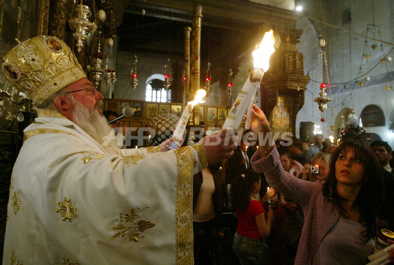 【ベツレヘム/パレスチナ自治区 7日 AFP】世界各地では、キリスト教の行事、復活祭(イースター)が祝われている。ヨルダン川西岸(West Bank)のベツレム(Bethlehem)でも7日、聖誕教会(Church of the Nativity)で聖土曜日を祝うミサが行われた。写真は、ミサに参列した人々へ聖なる炎を分け与えるローマ正教の司祭。(c)AFP/MUSA AL-SHAER