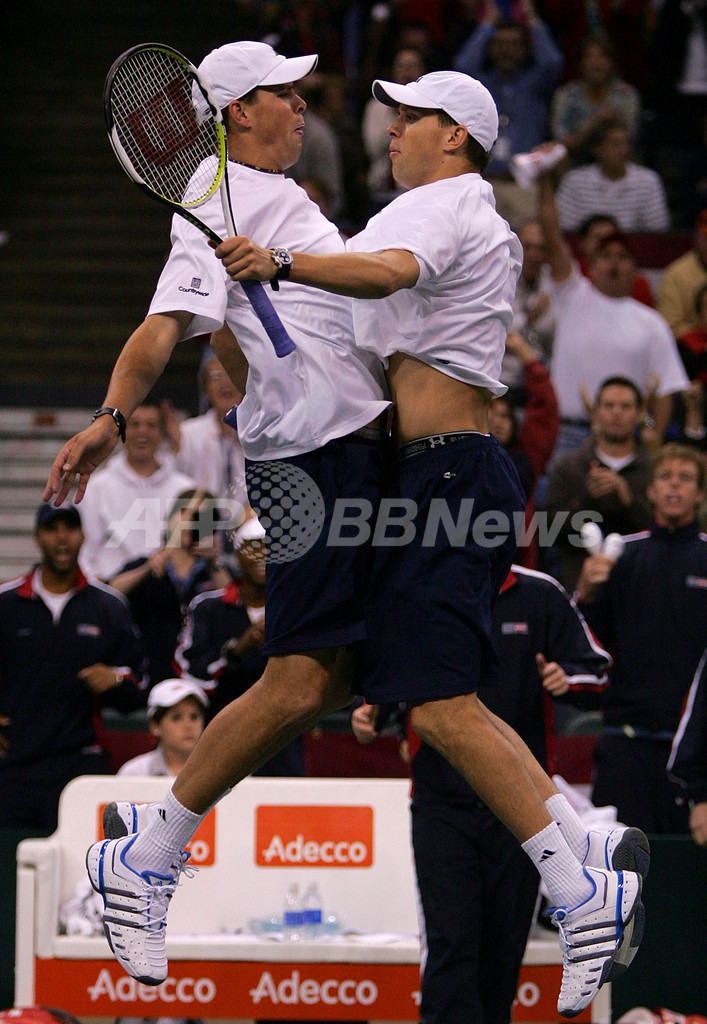 【ウィンストン・セーラム/米国 7日 AFP】男子テニス・デビスカップ(2007 Davis Cup)、ワールドグループ2007・準々決勝、米国vsスペイン。米国のボブ・ブライアン(Bob Bryan)/マイク・ブライアン(Mike Bryan)組は第3試合ダブルスでスペインのフェリシアーノ・ロペス(Fernando Verdasco)/フェルナンド・ベルダスコ(Feliciano Lopez)組と対戦。ブライアン兄弟はセットカウント3-1(7-5、6-3、3-6、7-6)で勝利を収め、米国は通算成績を3勝0敗としスペインンを降して準決勝進出を決めた。(c)AFP/Getty Images Matthew Stockman