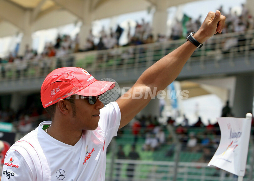 【クアラルンプール/マレーシア 8日 AFP】F1・2007年シーズン第2戦・マレーシアGP(Malaysian Grand Prix 2007)、決勝。レース前にパレードが行われ、ドライバーたちがクラシックカーやスポーツカーに乗って登場した。写真は、2番グリッドからスタートするマクラーレン・メルセデス(McLaren-Mercedes)のフェルナンド・アロンソ(Fernando Alonso)。(c)AFP/TEH ENG KOON