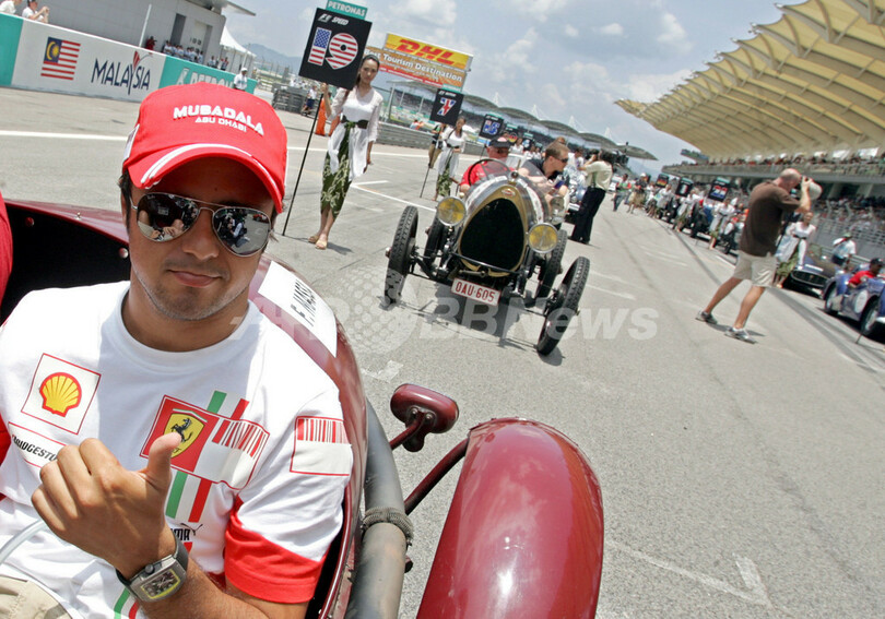【クアラルンプール/マレーシア 8日 AFP】F1・2007年シーズン第2戦・マレーシアGP(Malaysian Grand Prix 2007)、決勝。レース前にパレードが行われ、ドライバーたちがクラシックカーやスポーツカーに乗って登場した。写真は、2番グリッドからスタートするマクラーレン・メルセデス(McLaren-Mercedes)のフェルナンド・アロンソ(Fernando Alonso)。(c)AFP/TEH ENG KOON