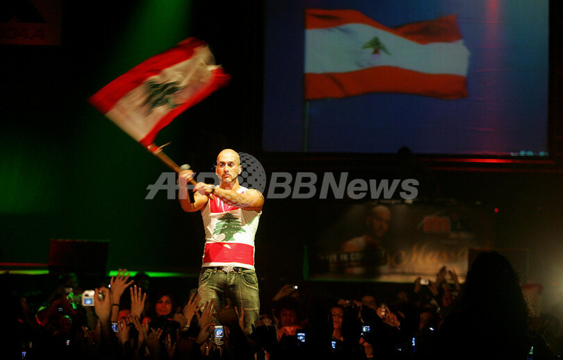 【ベイルート/レバノン 8日 AFP】レバノン出身のカナダ人R&B歌手のMassariが7日、母国レバノンでコンサートを行った。このコンサートは、親欧米派のフアド・シニオラ(Fuad Siniora)政権に抗議する人々が5か月にわたり座り込みを続ける場所からさほど遠くない会場で開催された。2005年2月14日にラフィク・ハリリ(Rafiq Hariri)元首相が暗殺され、シリア軍が撤退を強いられてから、レバノンは政治的混乱に陥っている。写真は、レバノン国旗が描かれているTシャツを着てパフォーマンスを行うMassari。(c)AFP/MARWAN NAAMANI