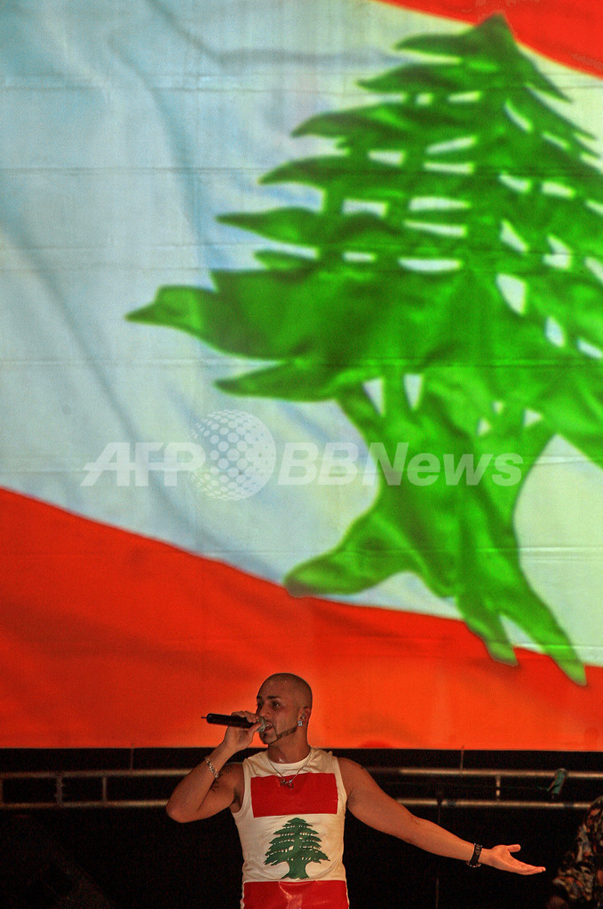 【ベイルート/レバノン 8日 AFP】レバノン出身のカナダ人R&B歌手のMassariが7日、母国レバノンでコンサートを行った。このコンサートは、親欧米派のフアド・シニオラ(Fuad Siniora)政権に抗議する人々が5か月にわたり座り込みを続ける場所からさほど遠くない会場で開催された。2005年2月14日にラフィク・ハリリ(Rafiq Hariri)元首相が暗殺され、シリア軍が撤退を強いられてから、レバノンは政治的混乱に陥っている。写真は、レバノン国旗が描かれているTシャツを着てパフォーマンスを行うMassari。(c)AFP/MARWAN NAAMANI