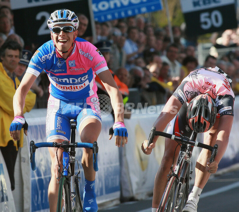 【ミールビーク/ベルギー 8日 AFP】自転車レース、第91回ロンド・ファン・フラーンデレン(91st Ronde van Vlaanderen)、ワンデイレース(ブルージュからミールビーク、259キロメートル)。ランプレ・フォンディタル(Lampre-Fondital)のアレッサンドロ・バッラン(Alessandro Ballan、イタリア)は、6時間10分15秒をマークして大会初優勝を飾った。(c)AFP/FRANCK FIFE