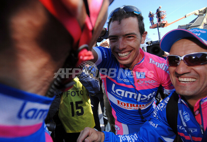 【ミールビーク/ベルギー 8日 AFP】自転車レース、第91回ロンド・ファン・フラーンデレン(91st Ronde van Vlaanderen)、ワンデイレース(ブルージュからミールビーク、259キロメートル)。ランプレ・フォンディタル(Lampre-Fondital)のアレッサンドロ・バッラン(Alessandro Ballan、イタリア)は、6時間10分15秒をマークして大会初優勝を飾った。(c)AFP/FRANCK FIFE