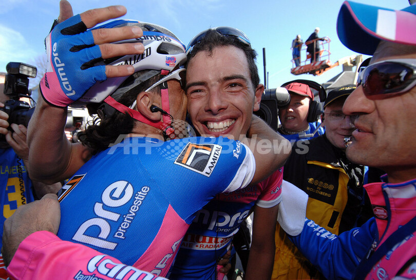 【ミールビーク/ベルギー 8日 AFP】自転車レース、第91回ロンド・ファン・フラーンデレン(91st Ronde van Vlaanderen)、ワンデイレース(ブルージュからミールビーク、259キロメートル)。ランプレ・フォンディタル(Lampre-Fondital)のアレッサンドロ・バッラン(Alessandro Ballan、イタリア)は、6時間10分15秒をマークして大会初優勝を飾った。(c)AFP/FRANCK FIFE