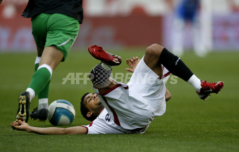 【セビリア/スペイン 8日 AFP】サッカー、スペイン・リーガエスパニョーラ1部・第29節、セビージャ(Sevilla)vsラシン・サンタンデール(Racing Santander)。試合はスコアレスドローに終わり、セビージャは首位奪還こそならなかったが首位バルセロナ(Barcelona)に勝ち点1差に肉薄した。写真は、判定に不満を表すセビージャのレナト(Renato)。(c)AFP/JOSE LUIS ROCA