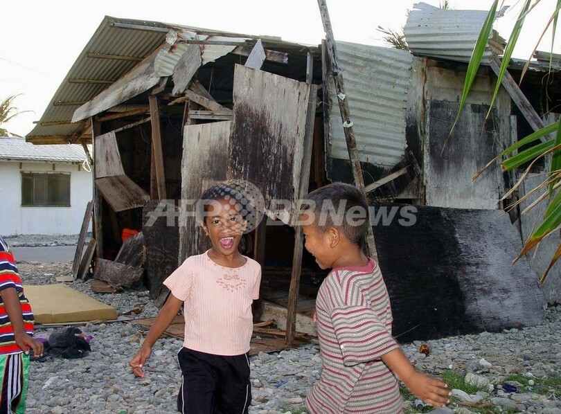 写真は、首都マジュロ(Majuro)の人口過密地域で、トタンで作られた家の前で遊ぶ子どもたち(2004年9月4日撮影)。(c)AFP/Suzanne MURPHY