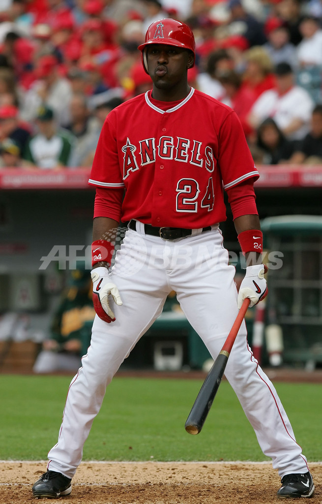 【アナハイム/米国 8日 AFP】07MLB、ロサンゼルス・エンゼルス・オブ・アナハイム(Los Angeles Angels of Anaheim)vsオークランド・アスレチックス(Oakland Athletics)。アスレチックスのミルトン・ブラッドリー(Milton Bradley)は、この試合4打数無安打に終わった。しかし試合はアスレチックスが2-1でエンゼルスを降し、今季3勝目を挙げた。写真は、チームメイトと勝利の喜ぶを分かち合うブラッドリー。(c)AFP/Getty Images Lisa Blumenfeld