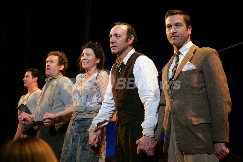 【ニューヨーク/米国 10日 AFP】ノーベル文学賞作家、ユージン・オニール(Eugene O’Neill)原作の演劇「日陰者に照る月(原題:A Moon For The Misbegotten)」が9日、ブルックス・アトキンソン・シアター(Brooks AtkinsonTheatre)で初日を迎えた。写真は、カーテンコールに登場した(左から)ユージン・オヘア(Eugene O’Hare)、コルム・ミーニー(Colm Meaney)、イヴ・ベスト(Eve Best)、ケヴィン・スペイシー(Kevin Spacey)、ビリー・カーター(Billy Carter)。(c)AFP/Getty Images Bryan Bedder