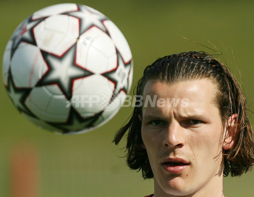 【ミュンヘン/ドイツ 10日 AFP】サッカー、欧州チャンピオンズリーグ(Champions League)・決勝トーナメント準々決勝。ACミラン(AC Milan)とのホームでの第2戦を翌11日に控えるバイエルン・ミュンヘン(Bayern Munich)は、クラブの練習場で最終調整を行った。写真は、ボールをリフティングするロイ・マカーイ(Roy Makaay)。(c)AFP/JOHN MACDOUGALL