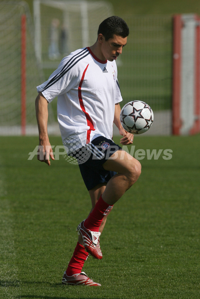 【ミュンヘン/ドイツ 10日 AFP】サッカー、欧州チャンピオンズリーグ(Champions League)・決勝トーナメント準々決勝。ACミラン(AC Milan)とのホームでの第2戦を翌11日に控えるバイエルン・ミュンヘン(Bayern Munich)は、クラブの練習場で最終調整を行った。写真は、ボールをリフティングするロイ・マカーイ(Roy Makaay)。(c)AFP/JOHN MACDOUGALL