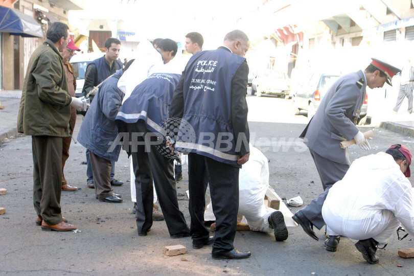 写真は同日、カサブランカ市内で2件目の自爆テロ犯の遺体を調べる鑑識班。(c)AFP
