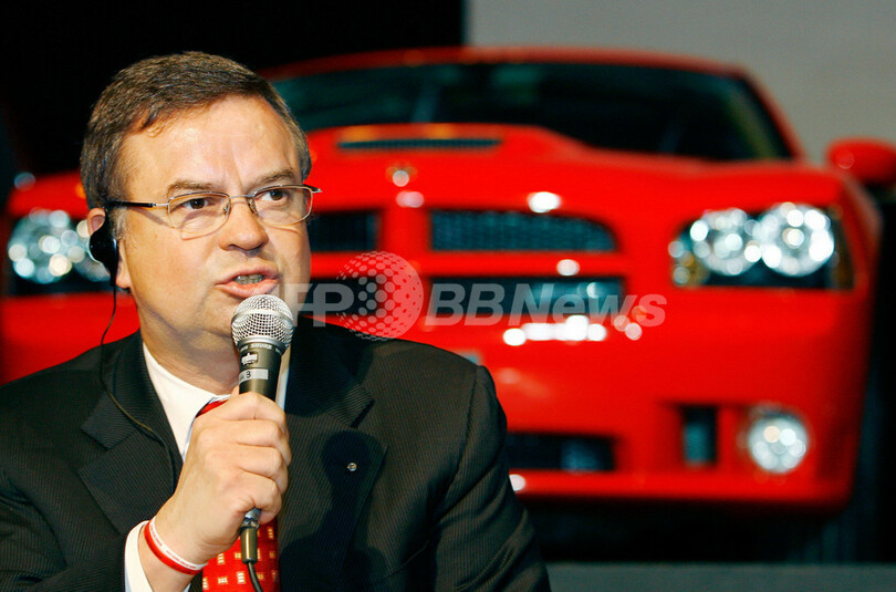 写真は同日、「ダッジ」ブランド車の前でポーズをとる同社のハンス・テンペル(Hans Tempel)社長兼最高経営責任者(右)とクリストファー・エリス(Christopher Ellis)副社長(左)。(c)AFP/Toru YAMANAKA