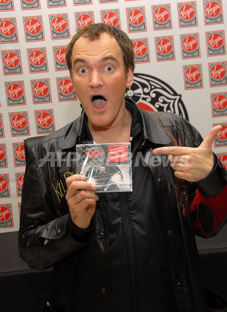【ロサンゼルス/米国 11日 AFP】クエンティン・タランティーノ(Quentin Tarantino)監督は10日、3日に発売された自身の新作映画「Death Proof」のサウンドトラックのプローモーションのためヴァージン・メガストア(Virgin Megastore)に登場し、サイン会を行った。写真は、CDを持ってポーズをとるタランティーノ監督。(c)AFP/Getty Images Charley Gallay