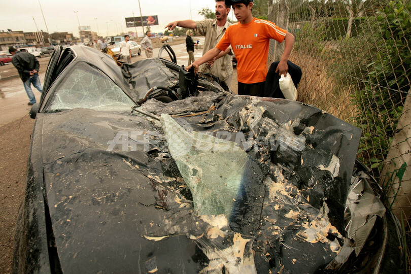 写真は11日、バグダッド中心部で米軍車両にひかれたとされる車を調べるイラク人(本記事とは無関係)。(c)AFP/ALI AL-SAADI