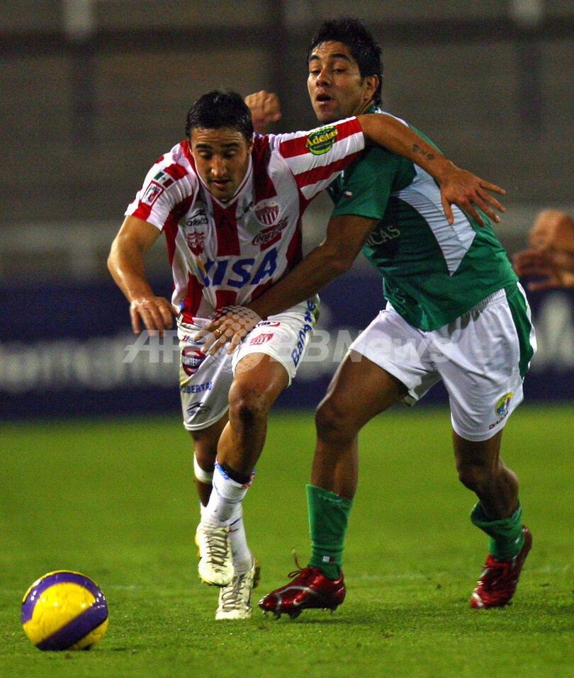 【サンティアゴ/チリ 11日 AFP】サッカー、リベルタドーレス杯南米選手権2007(Copa Libertadores de America 2007)・第2ラウンド、グループ2・第5節、アウダス・イタリアーノ(Audax Italiano Santiago、チリ)vsネカサ(Necaxa、メキシコ)。ネカサのファン・サルゲイロ(Juan Manuel Salgueiro)は、後半9分に同点ゴールを決めるも、チームを勝利に導くことはできなかった。試合はアウェーのネカサが1-2でアウダス・イタリアーノに敗れ、通算成績を3勝2敗とした。写真は、アウダス・イタリアーノのカルロス・ガッリード(Carlos Garrido、右)と競り合うサルゲイロ。(c)AFP/MARTIN BERNETTI