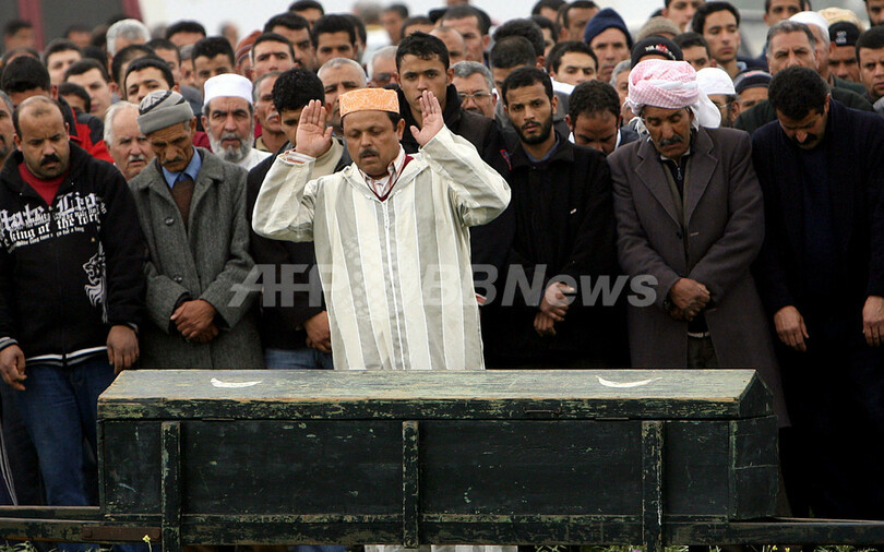 【アルジェ/アルジェリア 13日 AFP】首都アルジェ(Algiers)で発生した2件の自爆テロ事件を受け、ヌレディーヌ・ゼルーニ(Noureddine Zerhouni)内務・地方自治相は12日、都市部に治安部隊要員の追加配置を指示した。11日のテロ事件による死者は少なくとも33人、負傷者は220人以上に上っており、数人の重傷者を含む57人が現在も病院で治療を受けている。ゼルーニ内務・地方自治相は負傷者が入院中の病院を訪問後、事件による死者の数を33人と修正発表した。現地では国際テロ組織アルカイダ(Al-Qaeda)が活動を活発化させることへの懸念が高まっている。写真は12日、アルジェ近郊の町Maalmaで行われた、事件で死亡した男性の葬儀に出席する人々。(c)AFP/FAYEZ NURELDINE