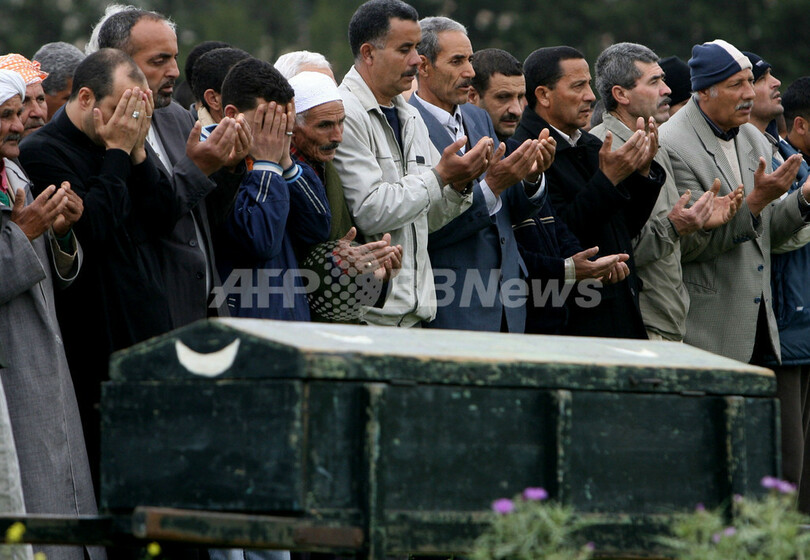 【アルジェ/アルジェリア 13日 AFP】首都アルジェ(Algiers)で発生した2件の自爆テロ事件を受け、ヌレディーヌ・ゼルーニ(Noureddine Zerhouni)内務・地方自治相は12日、都市部に治安部隊要員の追加配置を指示した。11日のテロ事件による死者は少なくとも33人、負傷者は220人以上に上っており、数人の重傷者を含む57人が現在も病院で治療を受けている。ゼルーニ内務・地方自治相は負傷者が入院中の病院を訪問後、事件による死者の数を33人と修正発表した。現地では国際テロ組織アルカイダ(Al-Qaeda)が活動を活発化させることへの懸念が高まっている。写真は12日、アルジェ近郊の町Maalmaで行われた、事件で死亡した男性の葬儀に出席する人々。(c)AFP/FAYEZ NURELDINE